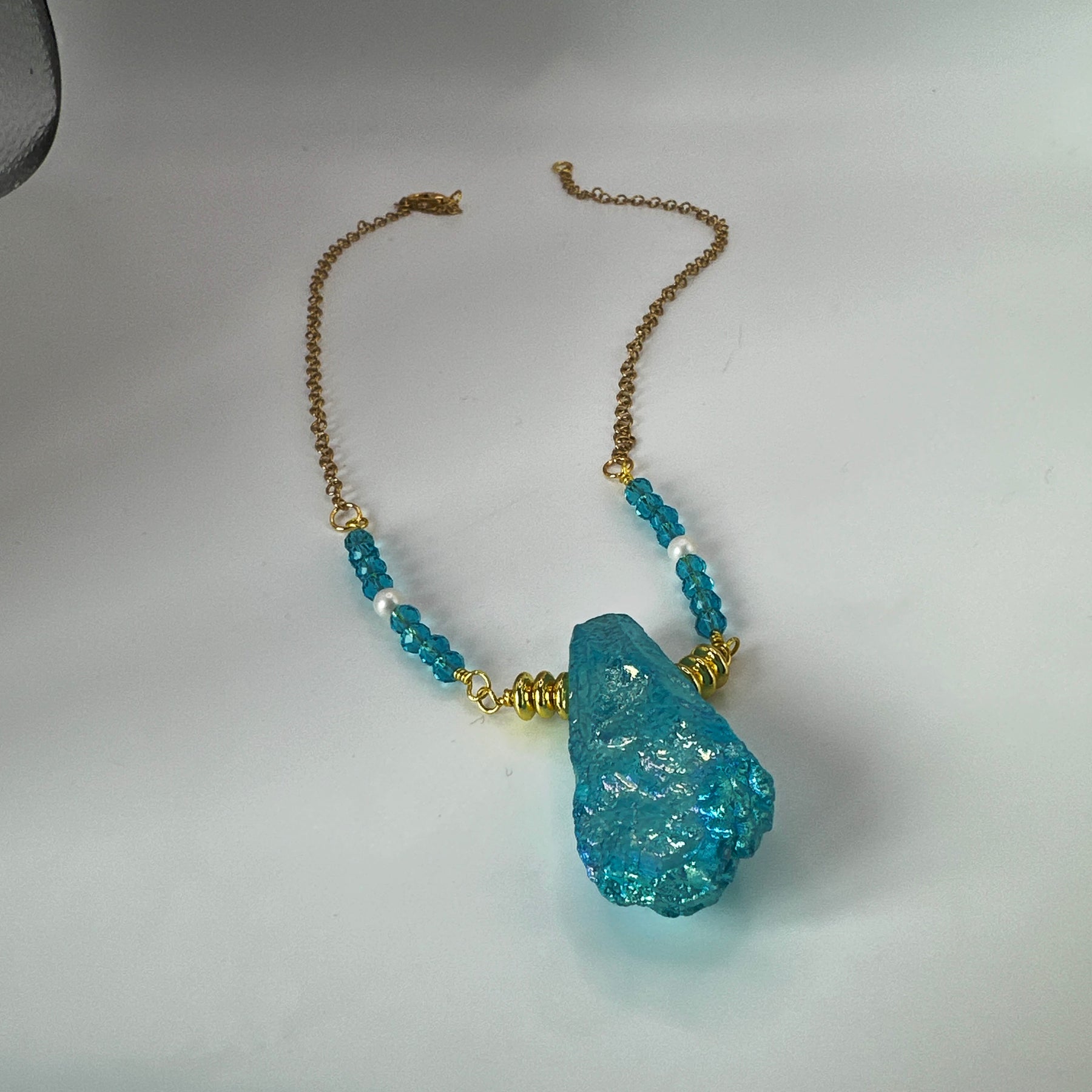 This Forzatina necklace expertly combines gold-washed steel with round brass accents, brilliant turquoise crystal rocks, and elegant pearl elements. Its refined design balances bold materials and delicate details, offering a sophisticated accessory that enhances both casual and formal ensembles with timeless style.